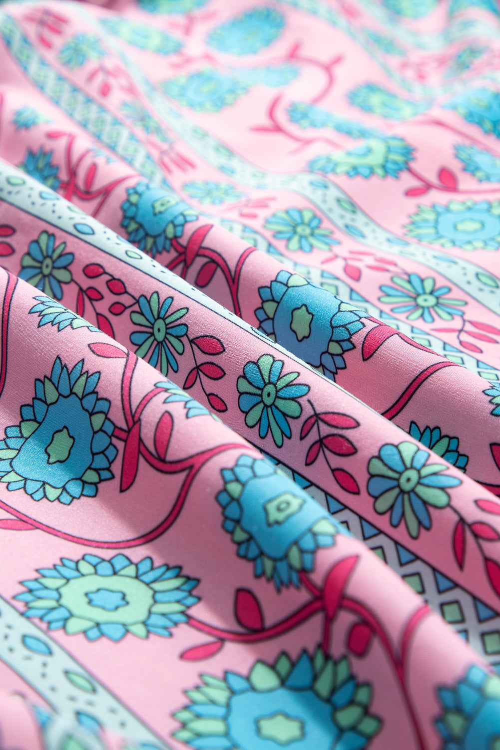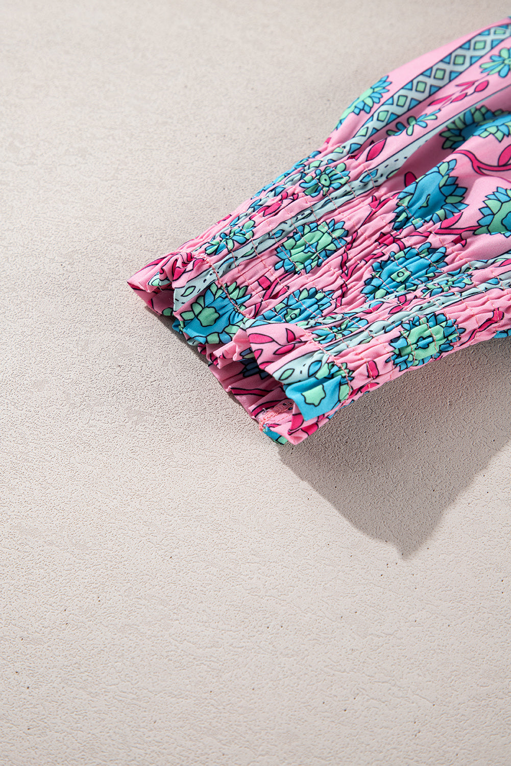 Pink Boho Floral Shirred Short Sleeve Belted Dress